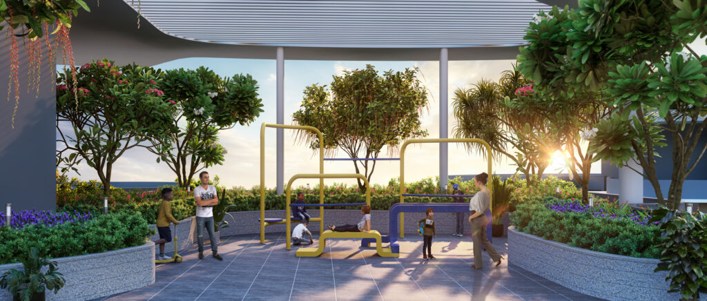 At the rooftop, residents can immerse themselves in the vibrant party zone, enjoy a BBQ area, engage in open-air workouts, or unwind in the tranquil forest cabana—all while taking in breathtaking views that elevate both relaxation and social gatherings to new heights.