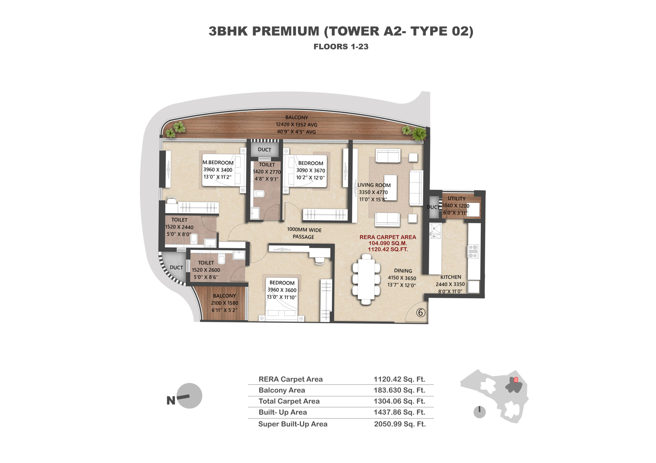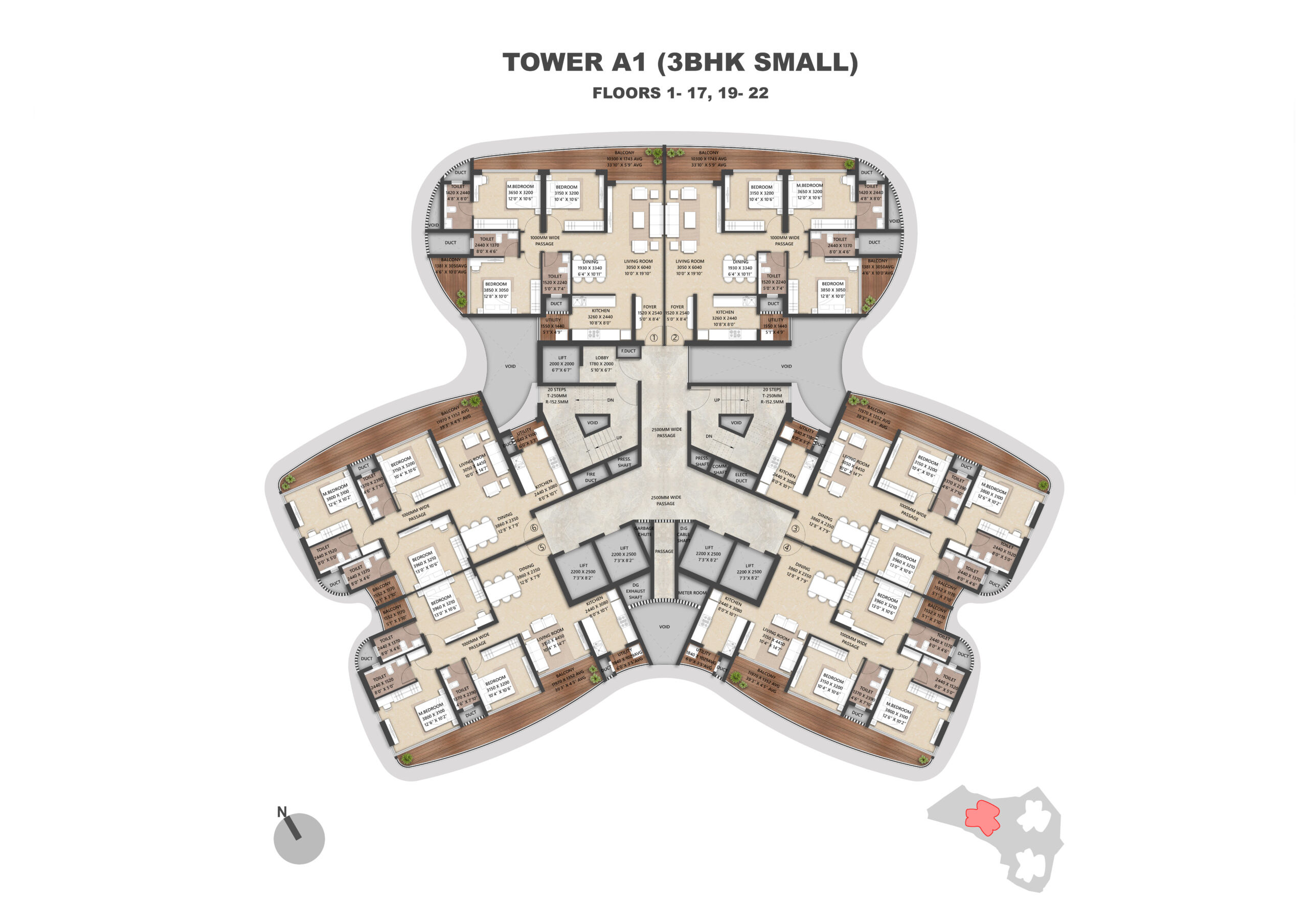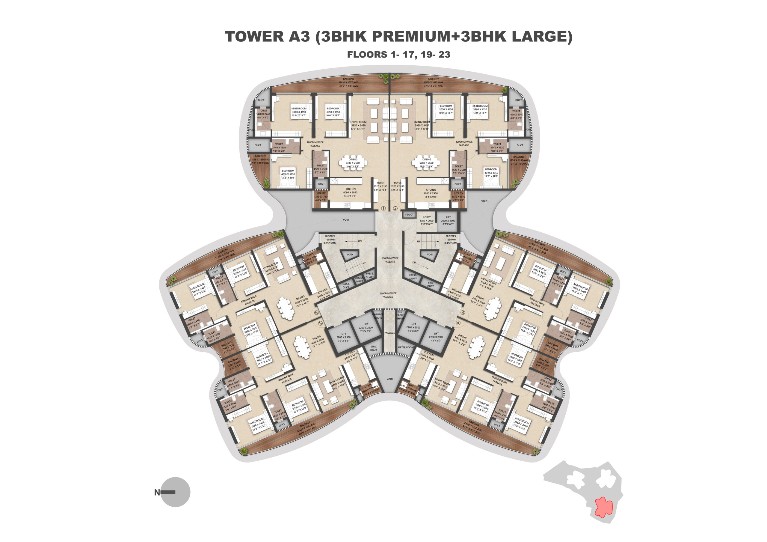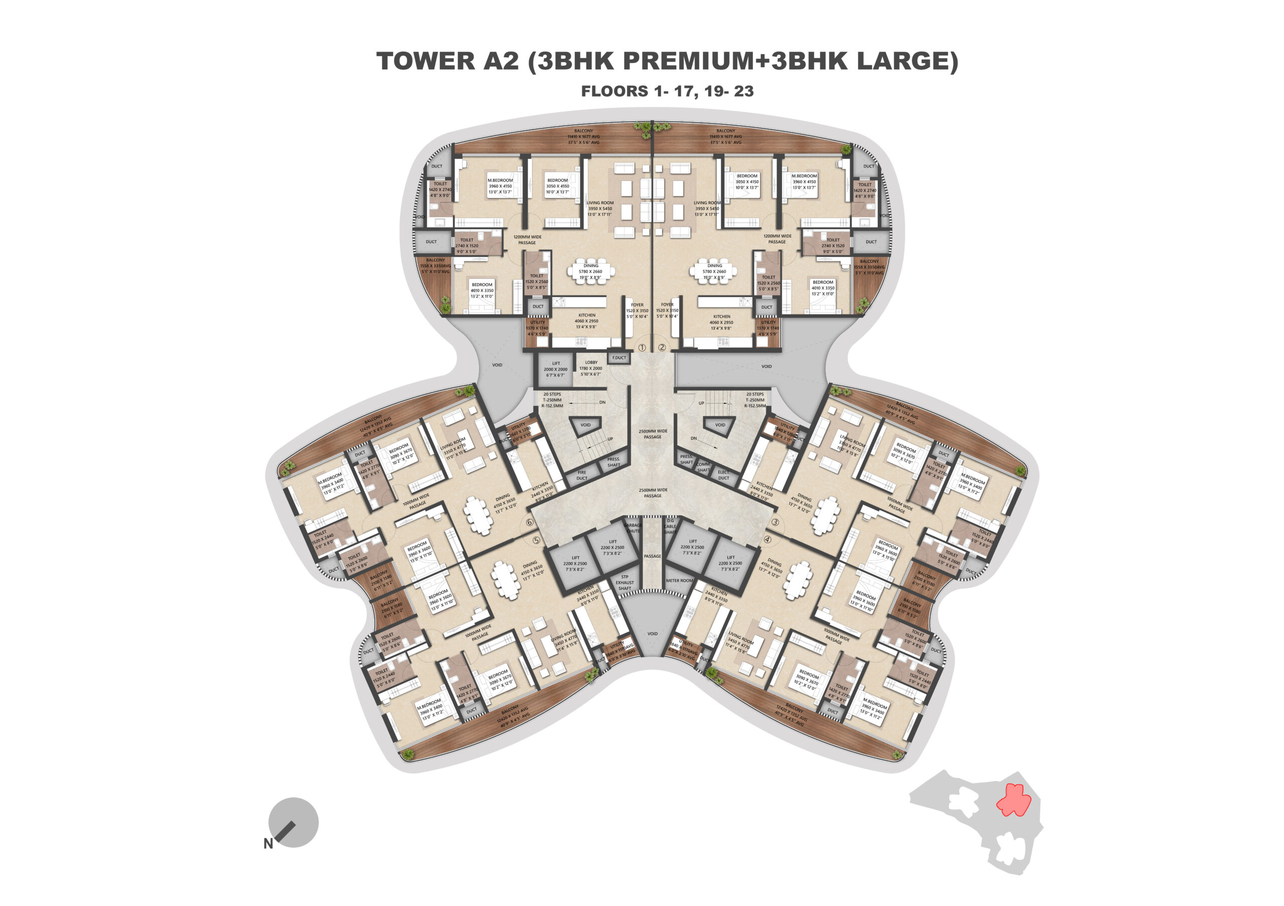 Tower 2 of Amani is divided into 6 units with lively 3-bedded occupancies with expansive carpet areas, across 1-17 and 19-23 floors.